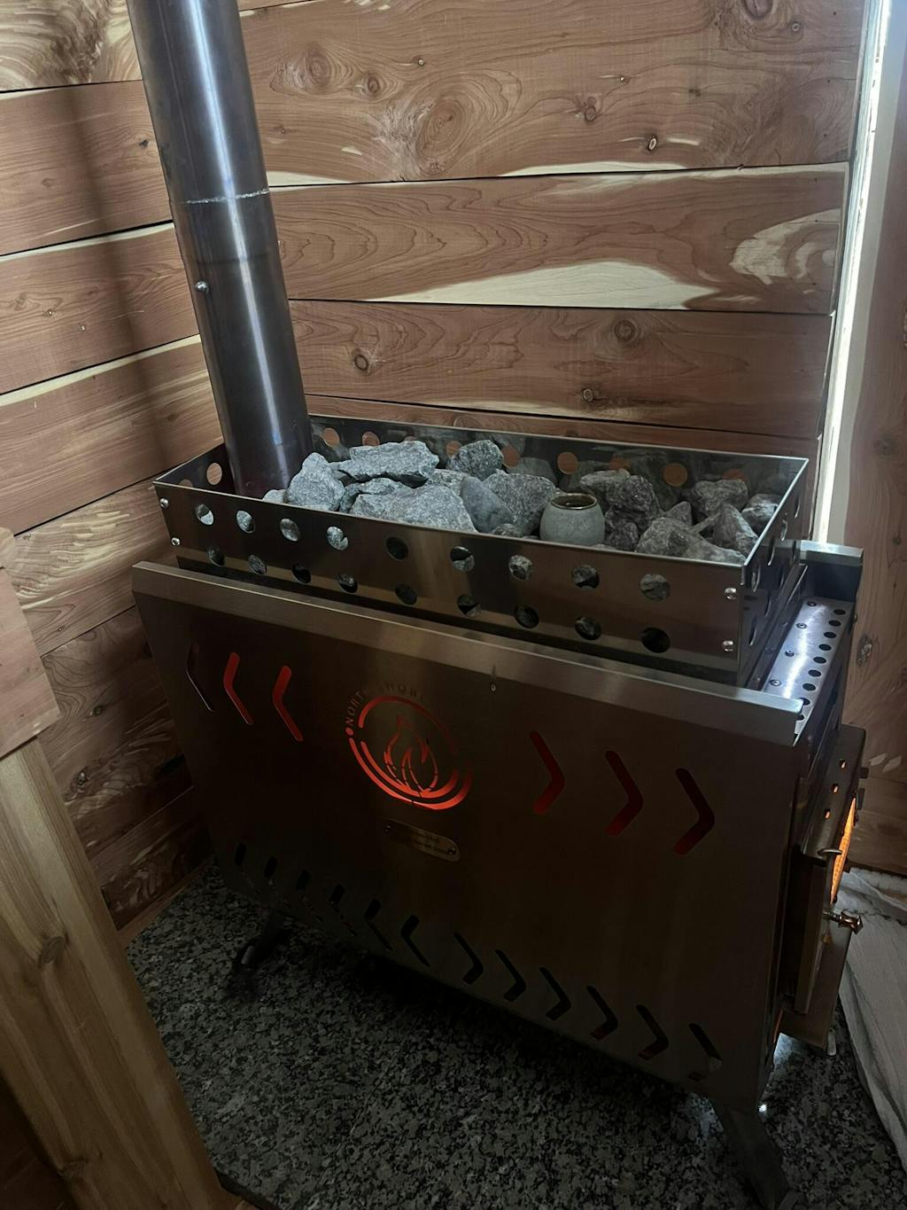 Our sauna wood stove XL is considerably wider than our standard stove and made with thicker metal, making it more durable and a more even heat. It also holds more sauna stones so you can enjoy more steam!